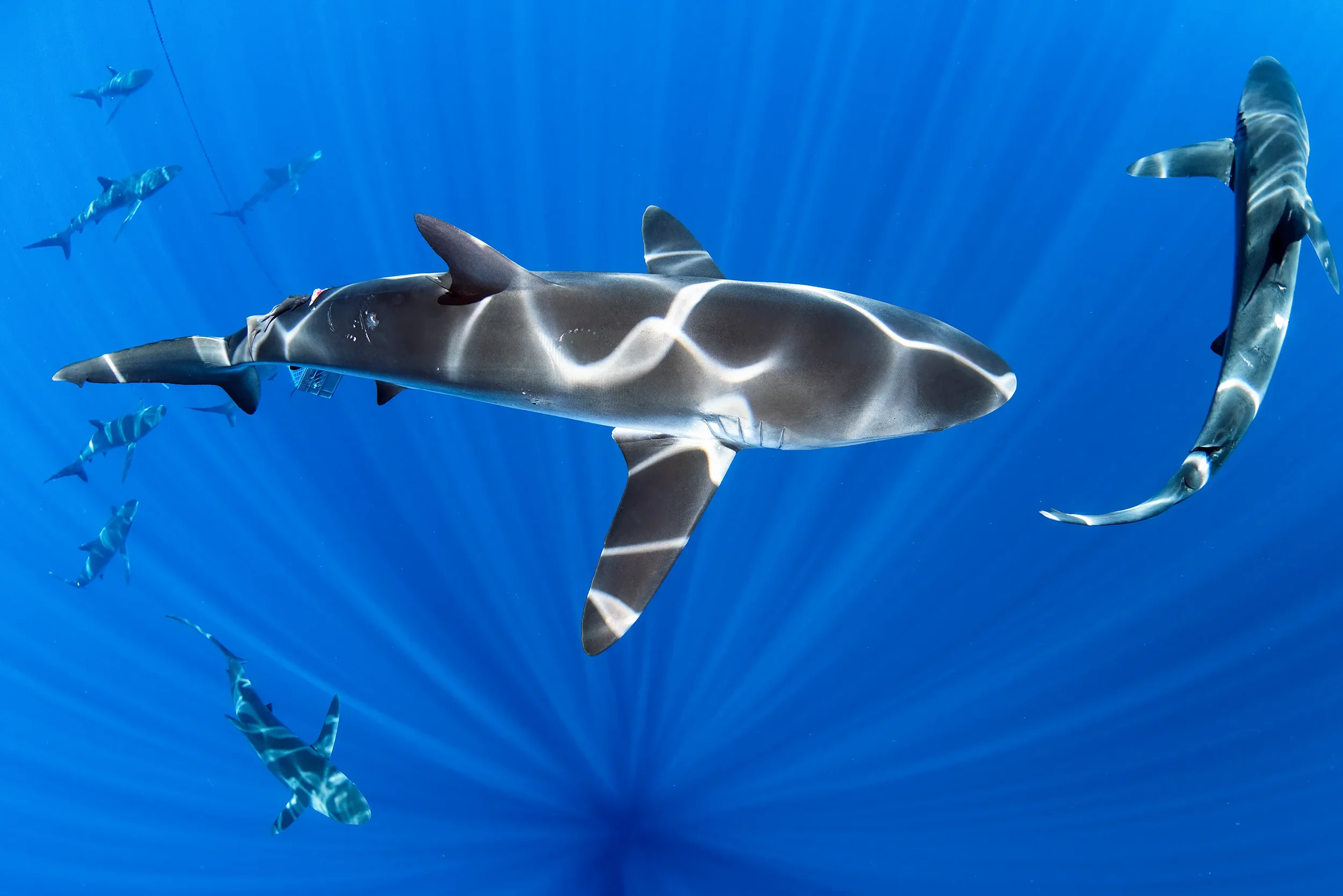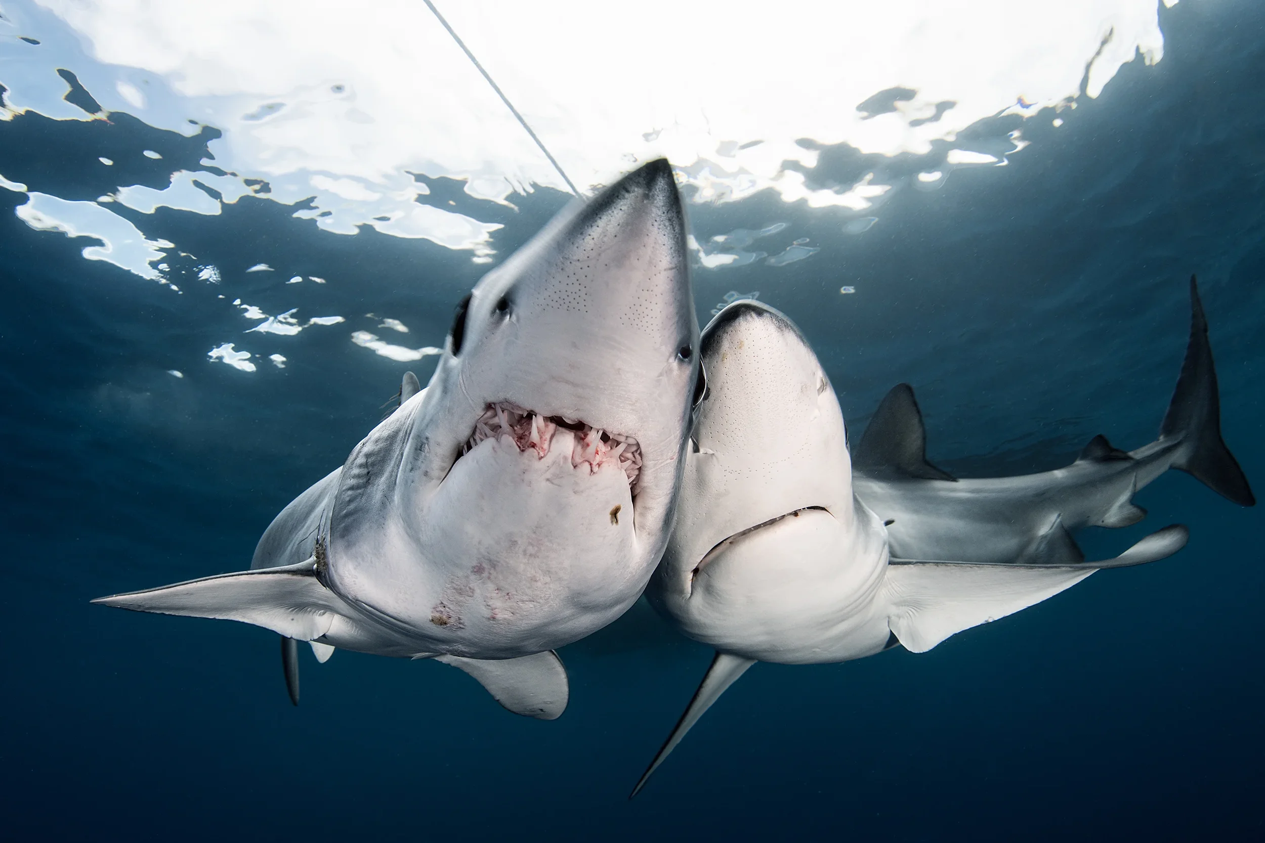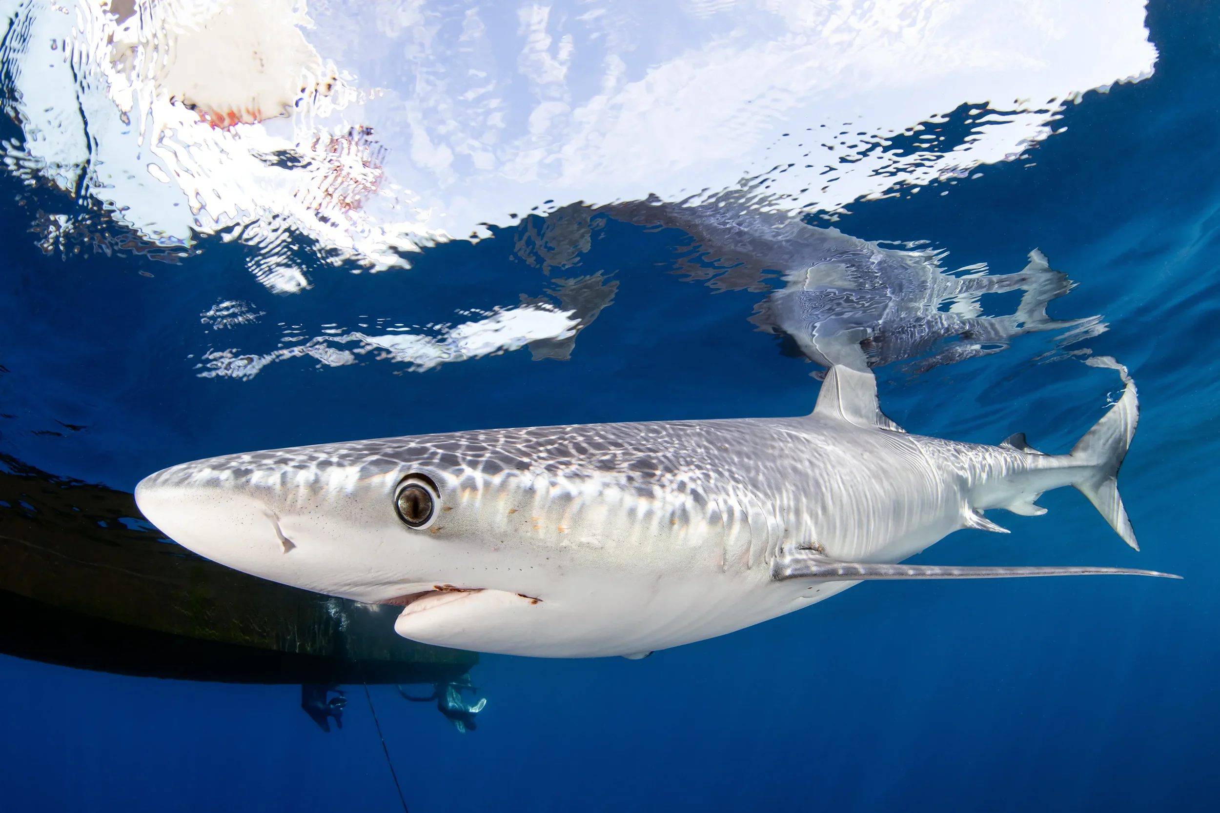 The two star species here are the short fin mako shark and the blue shark—both pelagic predators known for their inquisitive natures, though in very different ways.